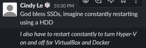 It was beautiful, the options being available for the Linux based engine instead of Hyper-V. This meant many great things, some that I’ll go into in the next chapter, and others that I’ll specify with as simply: I don’t need Hyper-V itself for anything. I can run Android Studio alongside Docker for example without having to route one through Hyper-V and break runtime compatibility with the other. Cindy, you know just how much pain this causes. Having gotten to this point, I opted to start saving links which would become a pull request with updated documentation expanding on using WSL 2 for all Windows 10 editions.